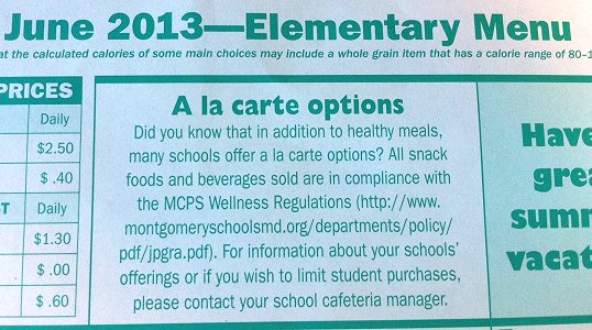 Read more... June, 2013 At our request, MCPS published a blurb on their elementary school menus indicating to parents that there are a la carte foods sold at the schools and that parents can limit their student's purchases by contacting their cafeteria manager. May, 2013 At our request, MCPS published a blurb on their elementary school menus indicating to parents that there are a la carte foods sold at the schools. April, 2013